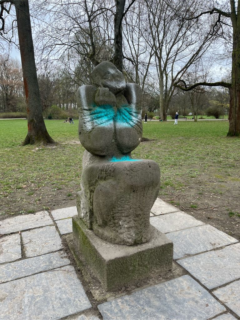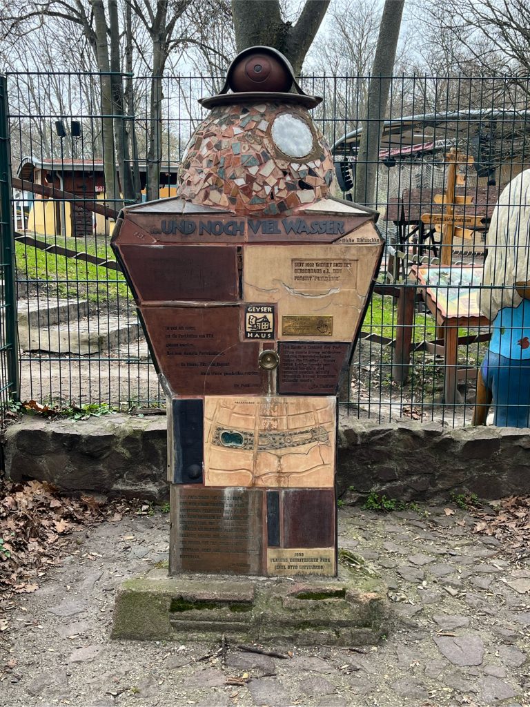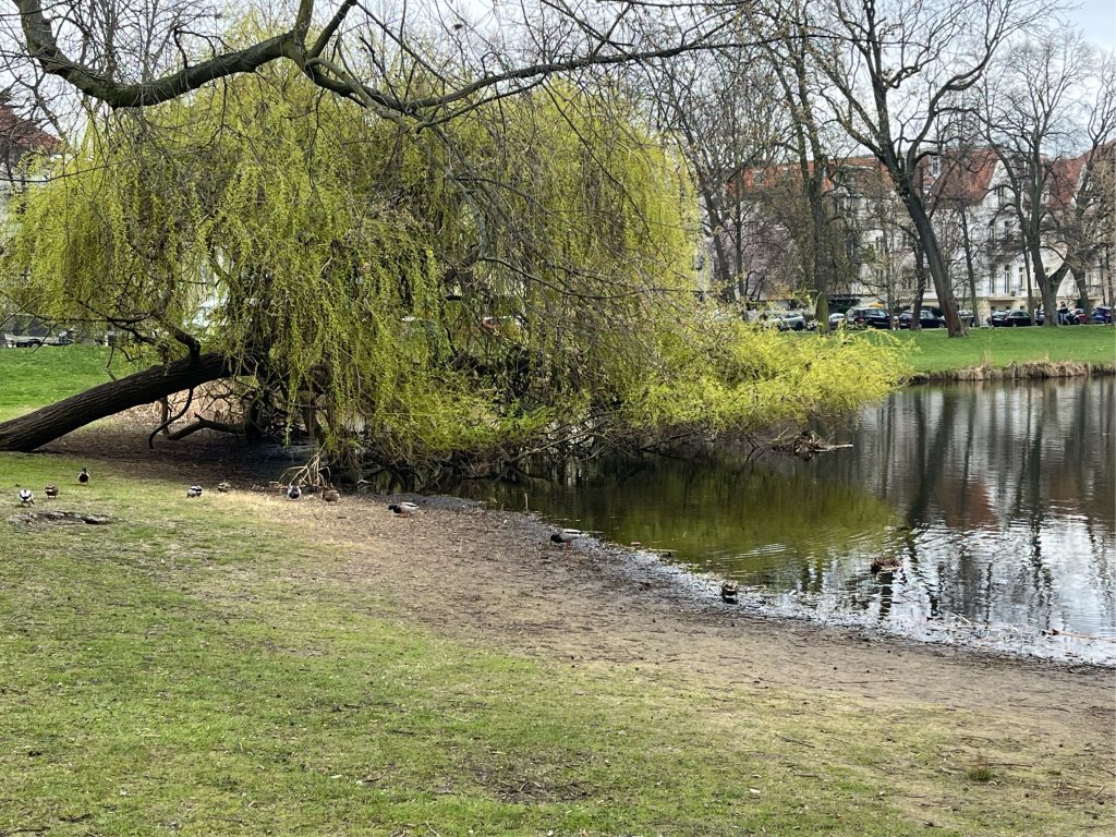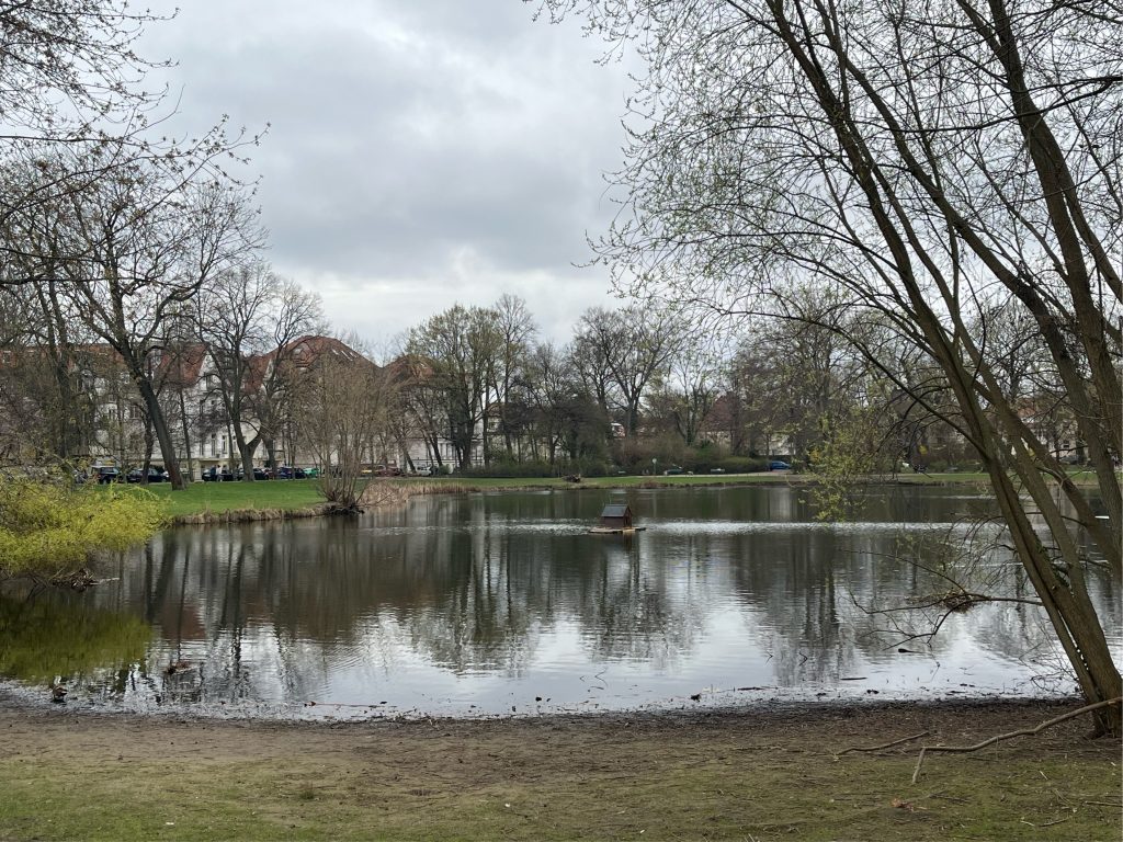 Enten auf dem Teich, Seeroseninseln, Blumenwiesen, verwildertes Unterholz, gepflegte Wege, ein Bach und ein stillgelegter Sportplatz bieten jede Gelegenheit, den Park zu entdecken. Im Winter rodeln die Kinder am zugefrorenen Teich, im Sommer bietet ihnen das große Klettergerüst auf dem Spielplatz am Rondell jede Menge Abenteuer. Hier am Weg steht auch die Plastik „Die nachricht“- leider ließ auich außer ihtrem Namen nicht Erhellendes recherchieren. Falls jemand jemanden kennt, der/die etwas weiß, gern melden!