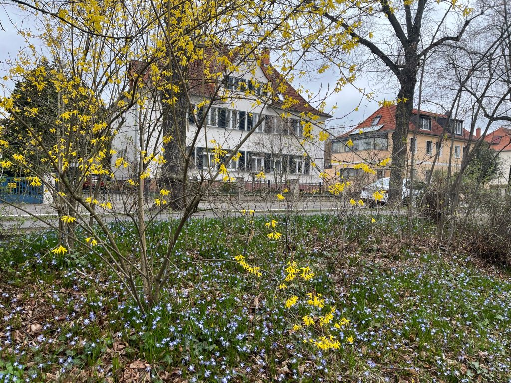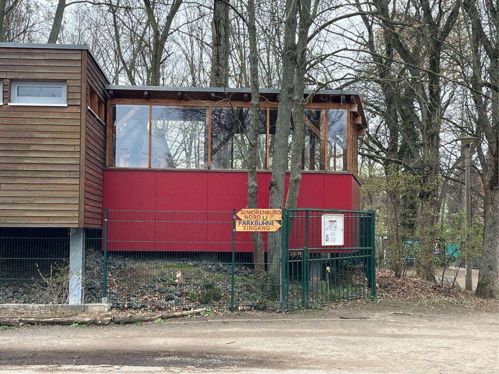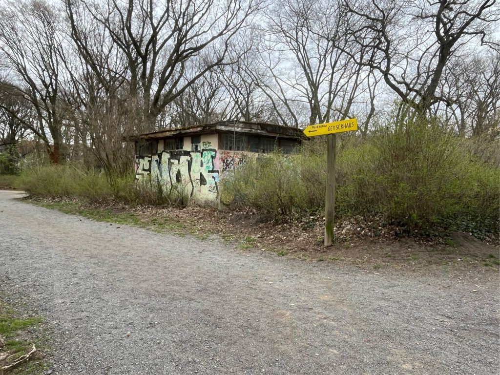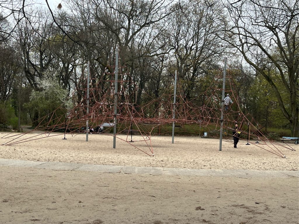 Enten auf dem Teich, Seeroseninseln, Blumenwiesen, verwildertes Unterholz, gepflegte Wege, ein Bach und ein stillgelegter Sportplatz bieten jede Gelegenheit, den Park zu entdecken. Im Winter rodeln die Kinder am zugefrorenen Teich, im Sommer bietet ihnen das große Klettergerüst auf dem Spielplatz am Rondell jede Menge Abenteuer. Hier am Weg steht auch die Plastik „Die nachricht“- leider ließ auich außer ihtrem Namen nicht Erhellendes recherchieren. Falls jemand jemanden kennt, der/die etwas weiß, gern melden!