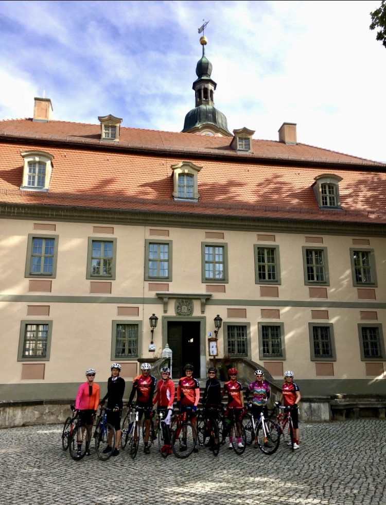 Samstag, 10 Uhr: An der Landsberger Straße 50, nahe der S-Bahnhaltestelle Coppiplatz, trifft sich wie jede Woche um diese Zeit eine sportlich gekleidete Gruppe Frauen – alle auf dem Rennrad, keine ohne Helm. Einziger Mann ist Team-Manager Jürgen, der im Juni 2017 die Roadbike Ladies Leipzig© gegründet hat, eine Gemeinschaft ambitionierter Fahrerinnen, die auf wechselnden Routen Distanzen zwischen 65 und 110 Kilometer in Angriff nimmt. Diesmal steht eine 72-km-Runde über Dörfer nordöstlich von Leipzig auf dem Plan. Sie führt zu drei Schlössern und einer Kirche und lässt sich dank gut ausgebauter Straßen sowie zahlreicher Radwege auch mit dem Tourenrad nehmen, an benannter Stelle sogar abkürzen.