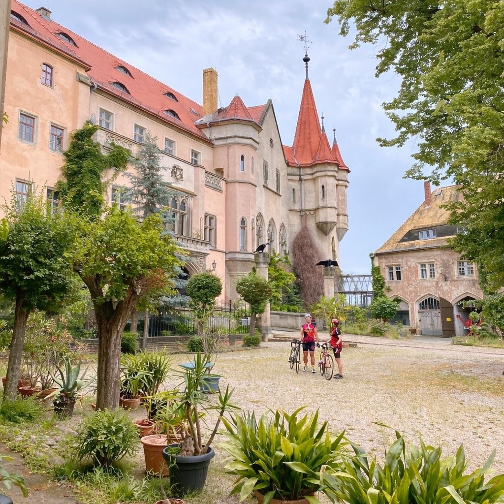 In Beucha ergibt sich ein Abstecher zur denkmalsgeschützten Bergkirche. Den schönsten Blick auf diese hochgelegene Wehrkirche hat man von einem Parkplatz am anderen Ufer des Steinbruchs direkt zu ihren Füßen. Die nächsten Kilometer radeln wir über Albrechtshain und Waldsteinberg nach Brandis, wo hinter dem historischen Marktplatz am barocken Stadtschloss ein Stopp lohnt. Besichtigt werden kann es nicht, es sei denn, man will hier feiern. Auf einer verkehrsarmen Landstraße führt der Weg weiter nach Machern. An der B 6 im Ort geradeaus, dann rechts abgebogen liegt Schloss Machern, wo just eine Hochzeitsgesellschaft fürs Foto posiert. Der Eisladen nebenan hat schon geöffnet und auch ein Restaurant gibt es am Platz. Damit wären die kulinarischen Highlights der Tour abgehakt. Wer hier eine Pause einlegen will, kann den Schlosspark besuchen. Den Landschaftsgarten im englischen Stil ließ Carl Heinrich August von Lindenau Ende des 18. Jahrhunderts anlegen – samt Pyramide, Hygiea-Tempel und Ritterburg-Ruine.